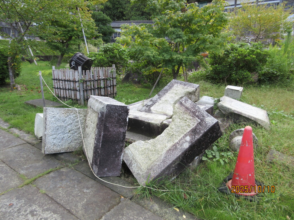 しかし、よく見ると2024年1月1日の能登半島大地震最大震度は7、により崩壊した石物があちこちに散乱しています。