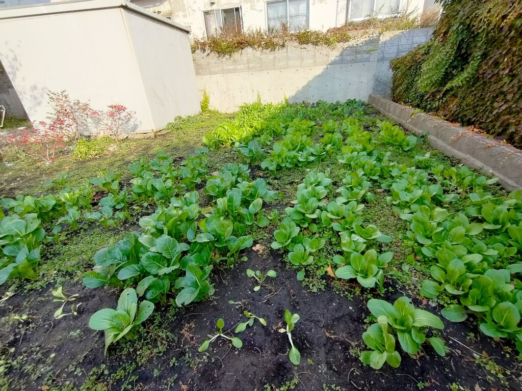 何を植えているのか?というと、まずはチンゲンサイ。漢字では青梗菜と書くのですね。