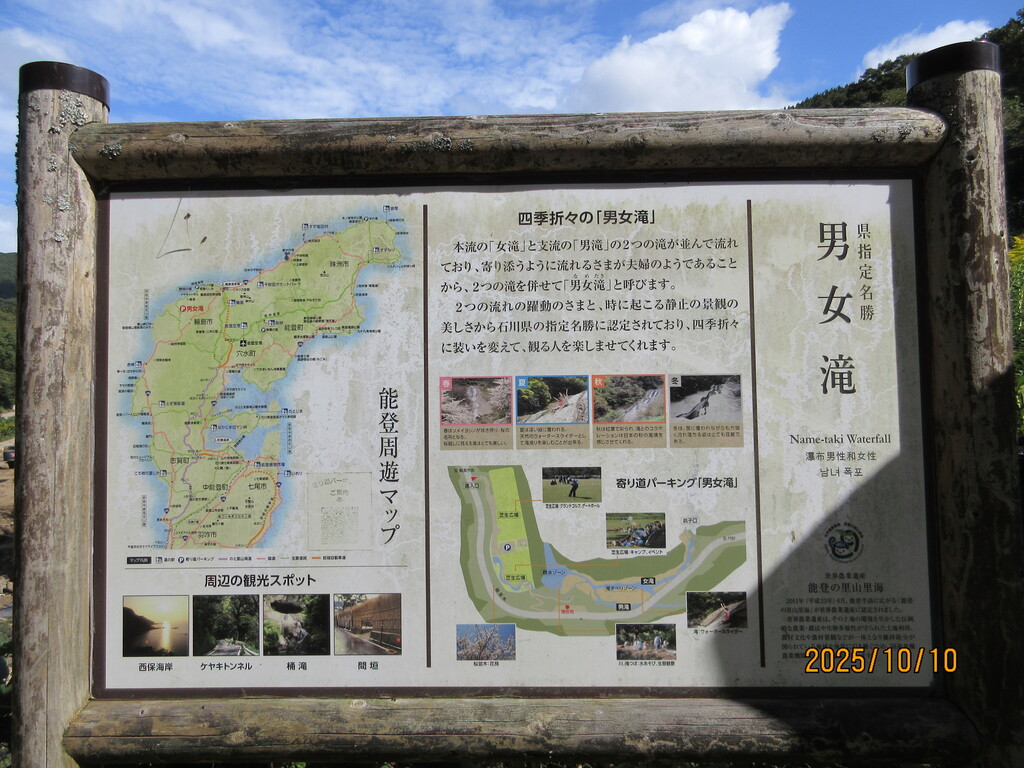 石川県が指定した名勝です。そういえば、能登半島には標高の高い山が少ないから滝もそうないので、ここは数少ない滝の名勝なのです。