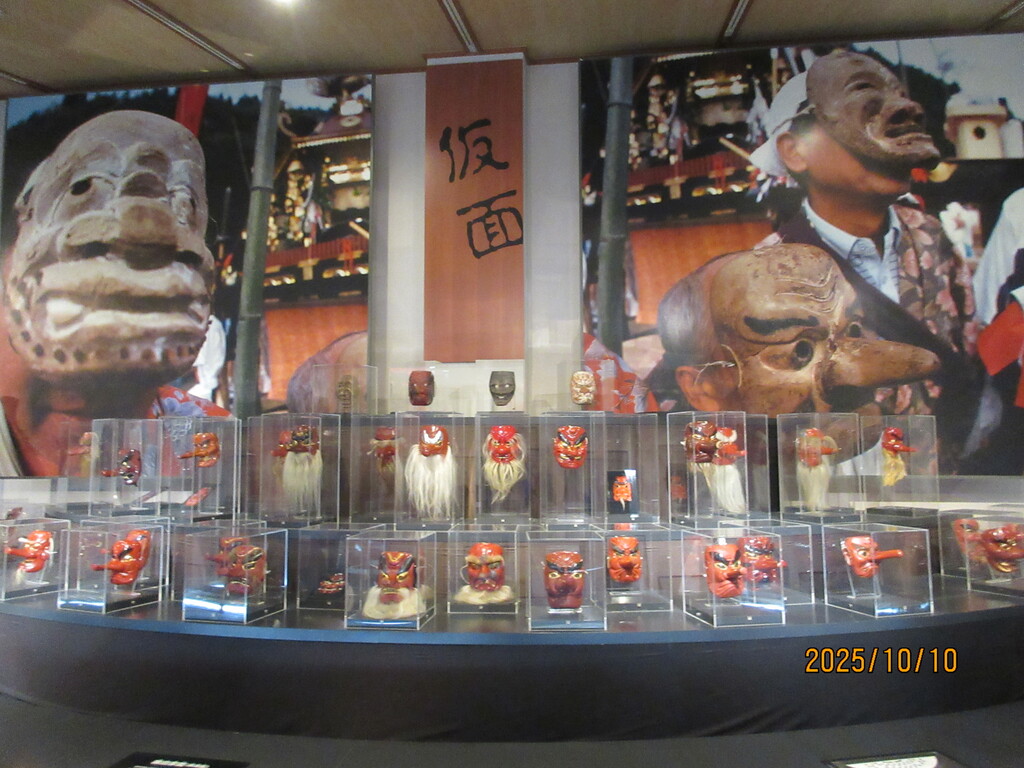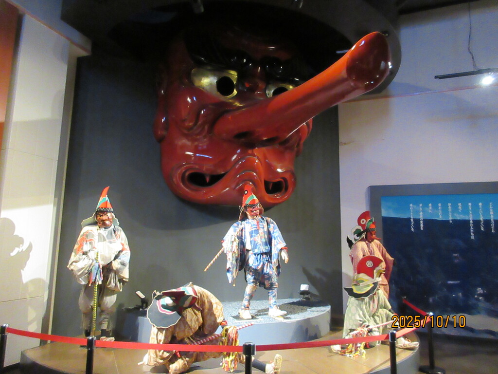 中島町の全集落、各末社から集められた猿田彦面や、羽田、太鼓、お道具類などの祭具が展示。いろんな天狗の顔が面白い。この辺りは秋田の「ナマハゲ館」みたいで、集落ごとにお面が少しずつ違う表情をしているのです。