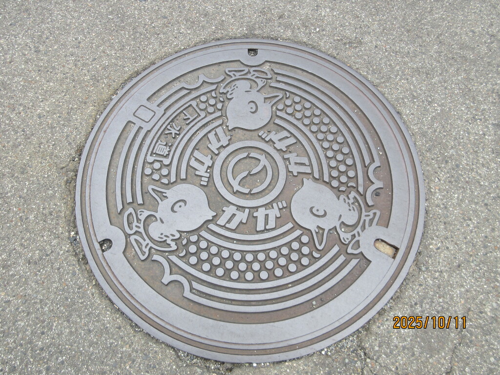 下を見たら、加賀市のマンホールはヒヨコ🐤が3匹。何で?